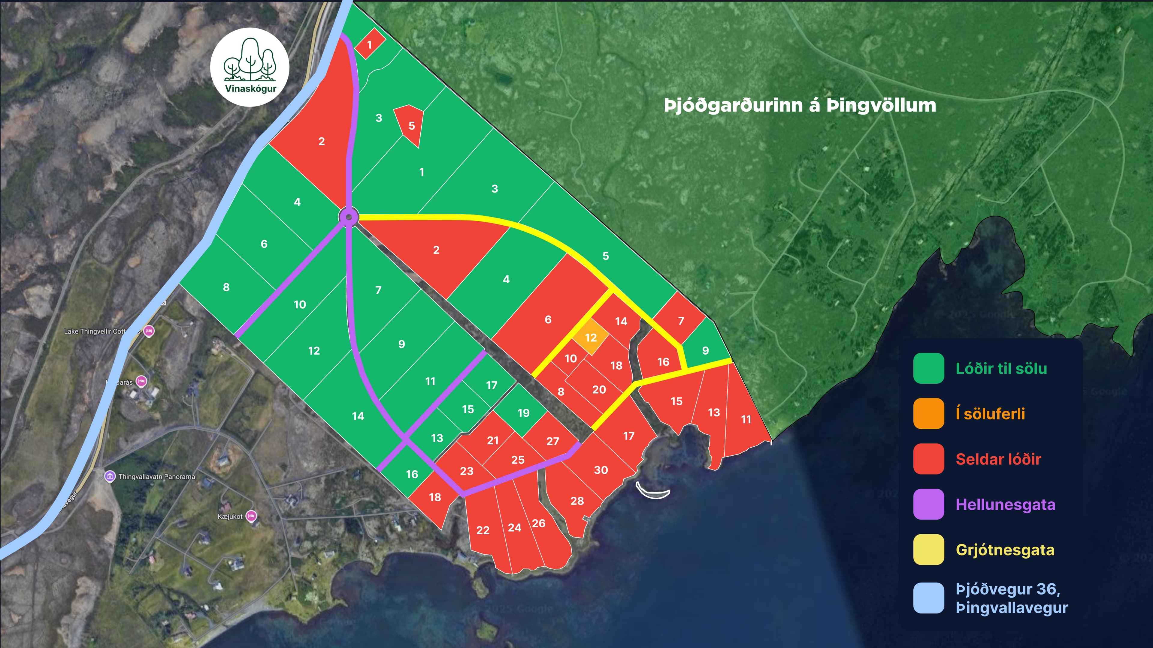 Yfirlitskort sem sýnir skipulag lóða í Skálabrekku Eystri við Þingvallavatn. Kortið sýnir staðsetningu einstakra lóða, götur innan svæðisins og stöðu þeirra – hvort þær eru til sölu, í söluferli eða þegar seldar. Svæðið samanstendur af bæði frístundalóðum og landbúnaðarlóðum í fallegu landslagi þar sem gróið land, melar og ásar mynda fjölbreytta náttúru í nágrenni við Þingvallavatn.